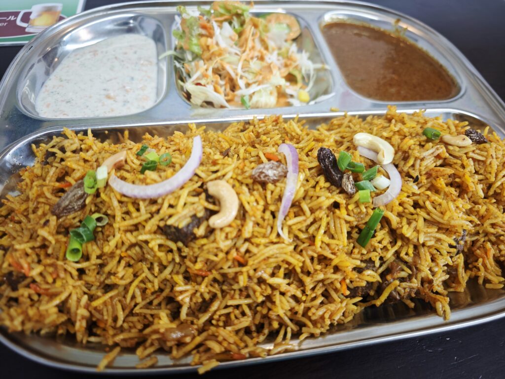 試験後にパキスタン屋さんに行こうとおもったけど臨時休業しており街を彷徨った結果、小山のインド屋さんにたどり着いた。ビリヤニを食べる。