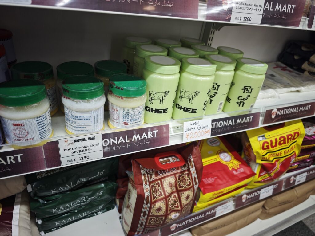 ギーが500mLで1150円とメチャ安いですねー。ギーはバターを煮て精製した油で、インド料理とかパキスタン料理には欠かせない食材です。日本でもカルディとかで売ってるんですけど、カルディだと珍しい高級品扱いでメチャ高いんですよね。
