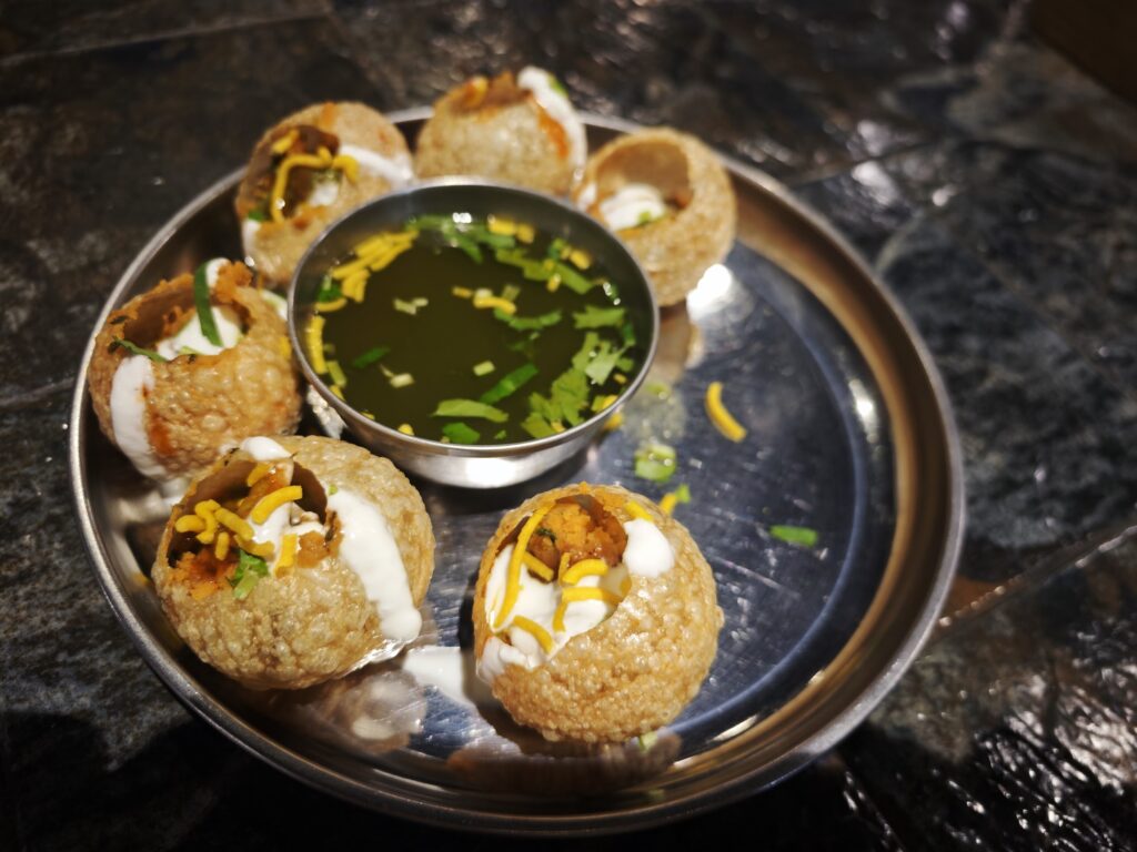 ピンポン玉みたいなパリパリの生地にカレー味の豆が入れてあって、さらに自分で真ん中の苦くて酸っぱい緑のスープを入れてパリッといただく料理です。これがガチで独特の味なんですけど、旨いんですよね~。世界には本当にいろんな食文化があります。