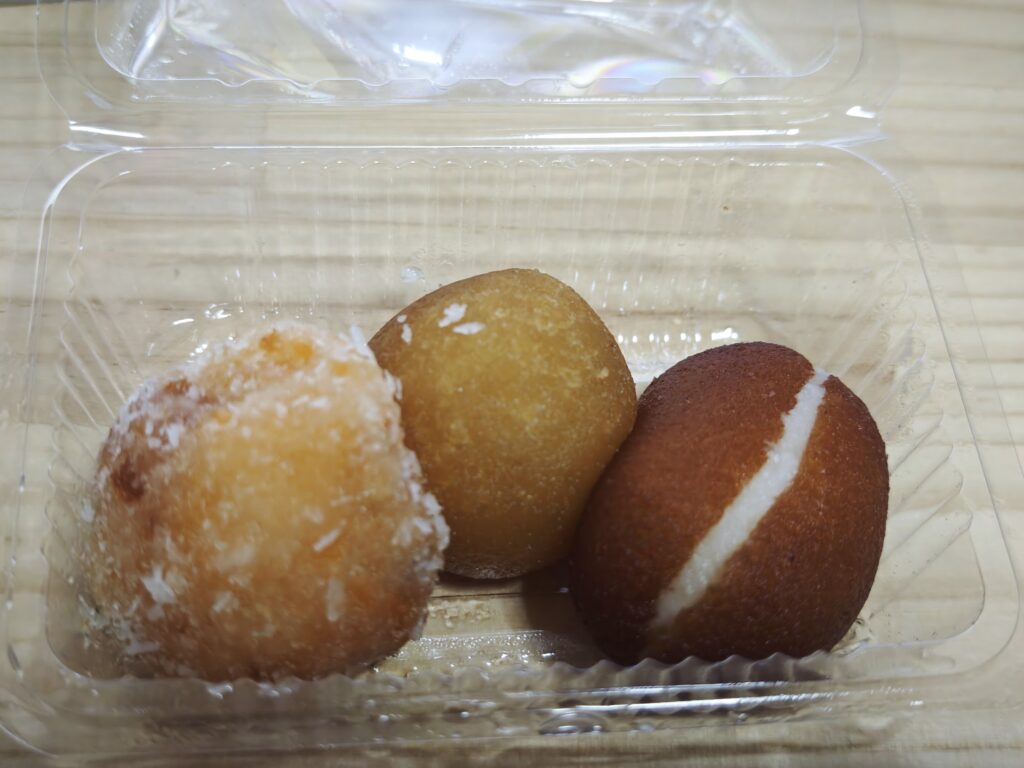 一番左はMilky ladduとか書いてあるドーナツで、ココナツの果肉がたくさん入ったドーナツです。